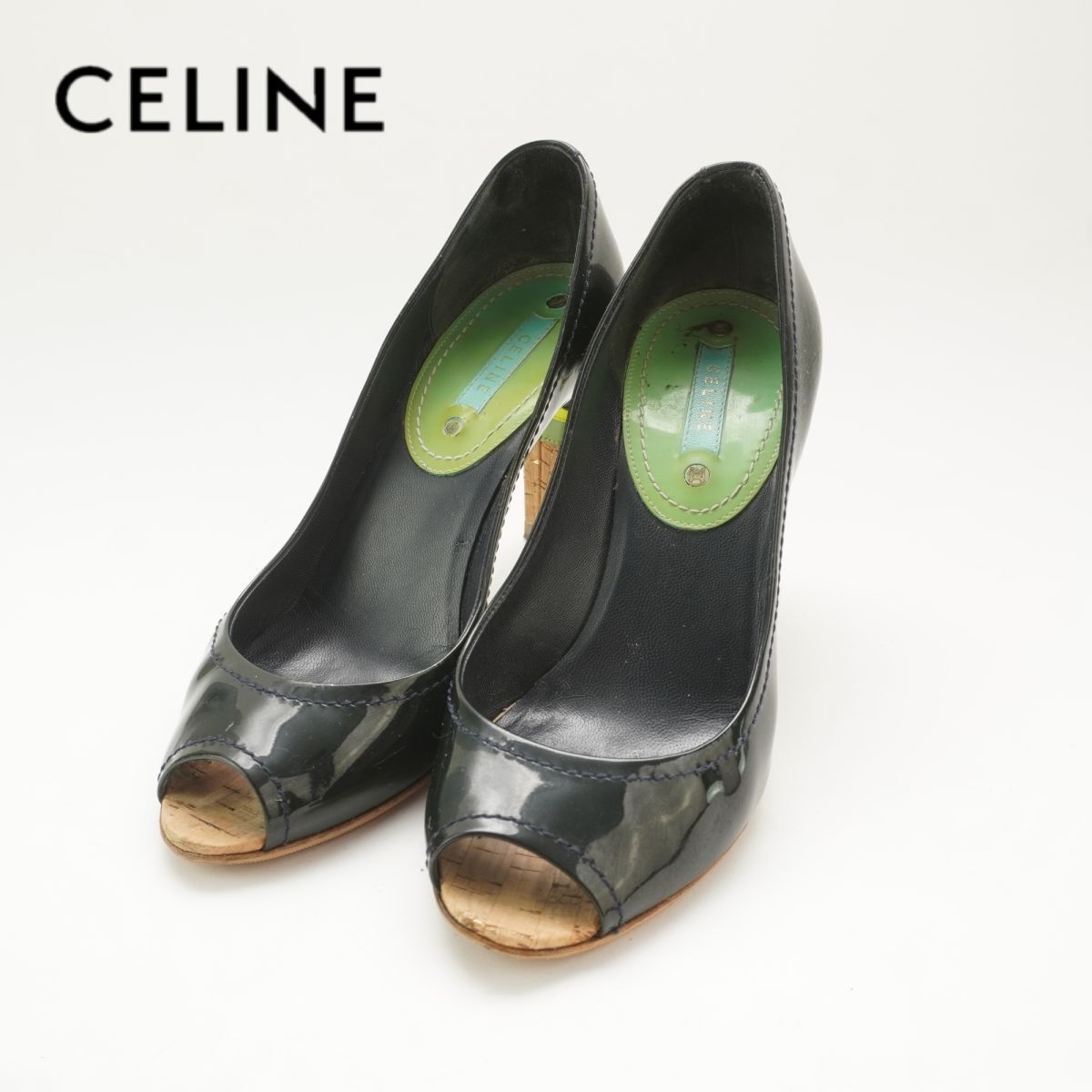 - CELINE セリーヌ 37 24.0 パンプス イタリア製 ヒール オープントゥ エナメル 黒 ブラック/RC32