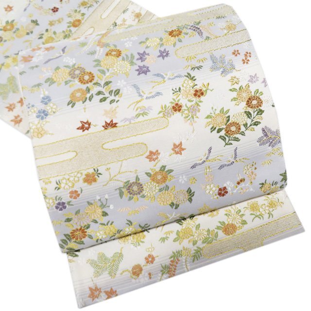 > 袋帯 中古 リサイクル 正絹 フォーマル 仕立て上がり 六通 ヱ霞に花模様 花鳥模様 灰白色 薄い青色 多色 金 きもの北條 A1063-10