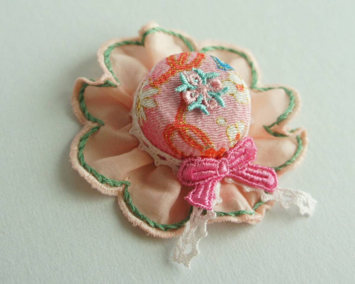 - ♪ ハンドメイド 帽子 ブローチ 綿レースにラインステッチ 縮緬 リボンのモチーフ トーションレース