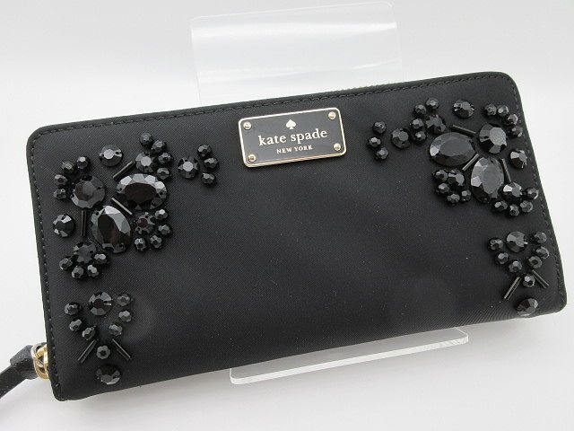 - ◆kate spade ケイトスペード ラウンドファスナー長財布 ビジュー ナイロン ブラック 黒 難有り 中古品
