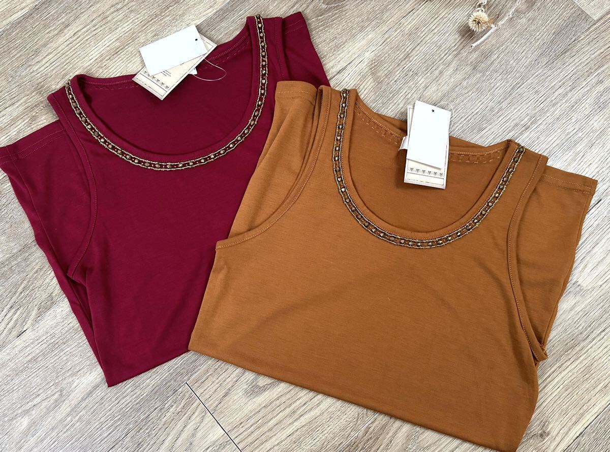- 新品 未使用 タグ付き 襟ビーズ スリム タンクトップ 2枚セット レーヨン混 Mサイズ なめらか肌ざわり