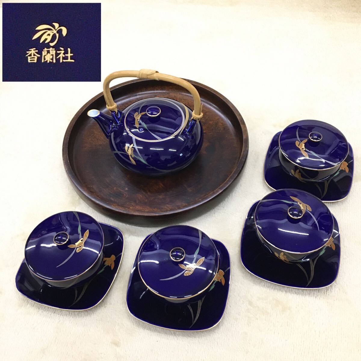 - 香蘭社 急須 蓋付き湯呑み 4客 茶托 角皿 盆 木製トレーセット 茶器 瑠璃 菖蒲 金彩装飾