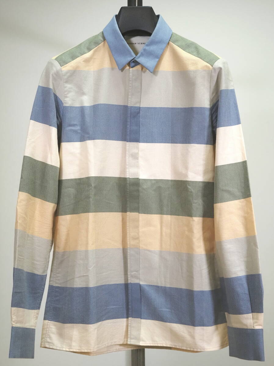 > 美品 STEPHAN SCHNEIDER ステファンシュナイダー パネルチェック比翼シャツ3青 Belgium製
