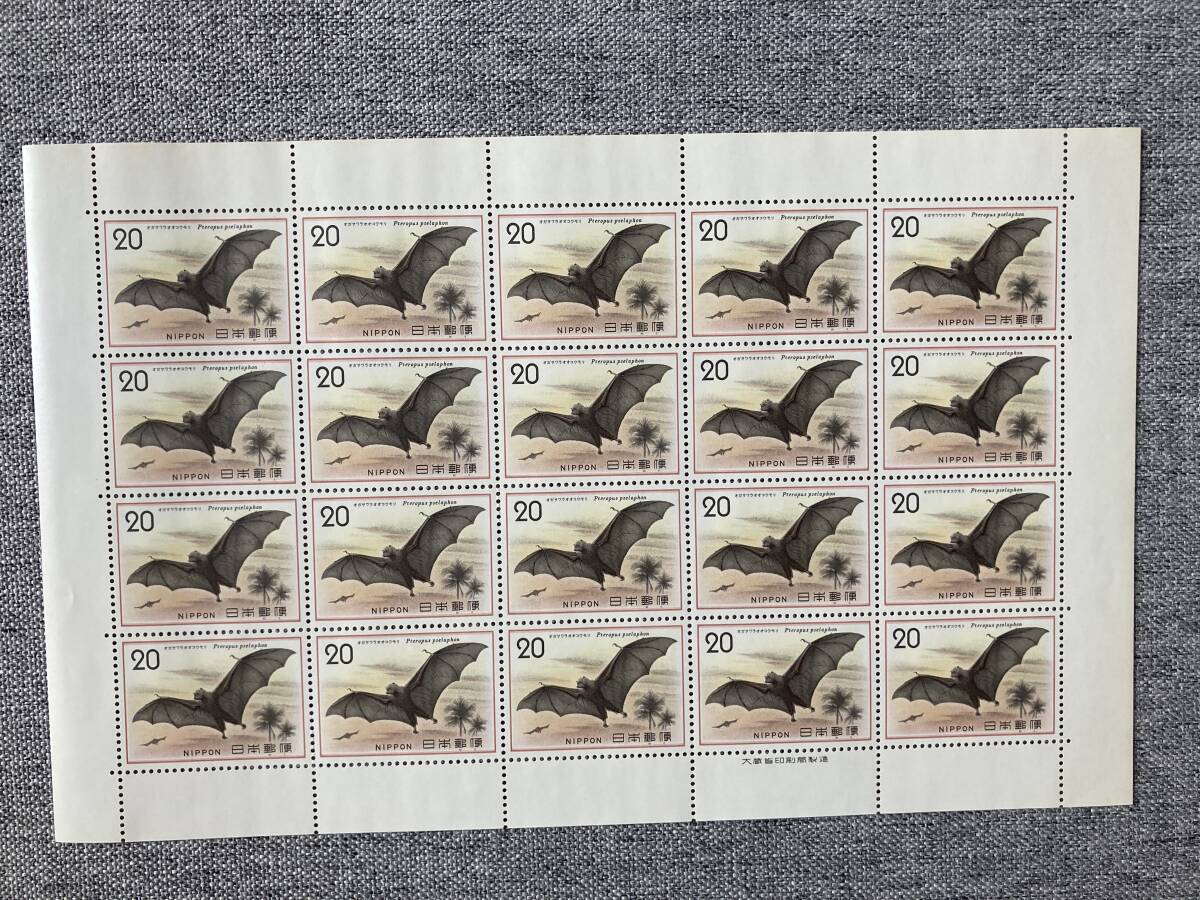 > ★未使用 自然保護シリーズ 第1集 鳥類 オガサワラオオコウモリ 蝙蝠 生き物 1974年 昭和49年 切手シート 20円 20枚 日本郵便