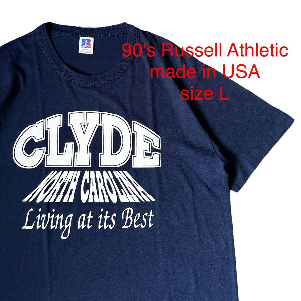 - USA製 90's Russell ラッセル ヴィンテージ Tシャツ ネイビー 紺 シングルステッチ カレッジ プリント L ノースカロライナ アメリカ 古着
