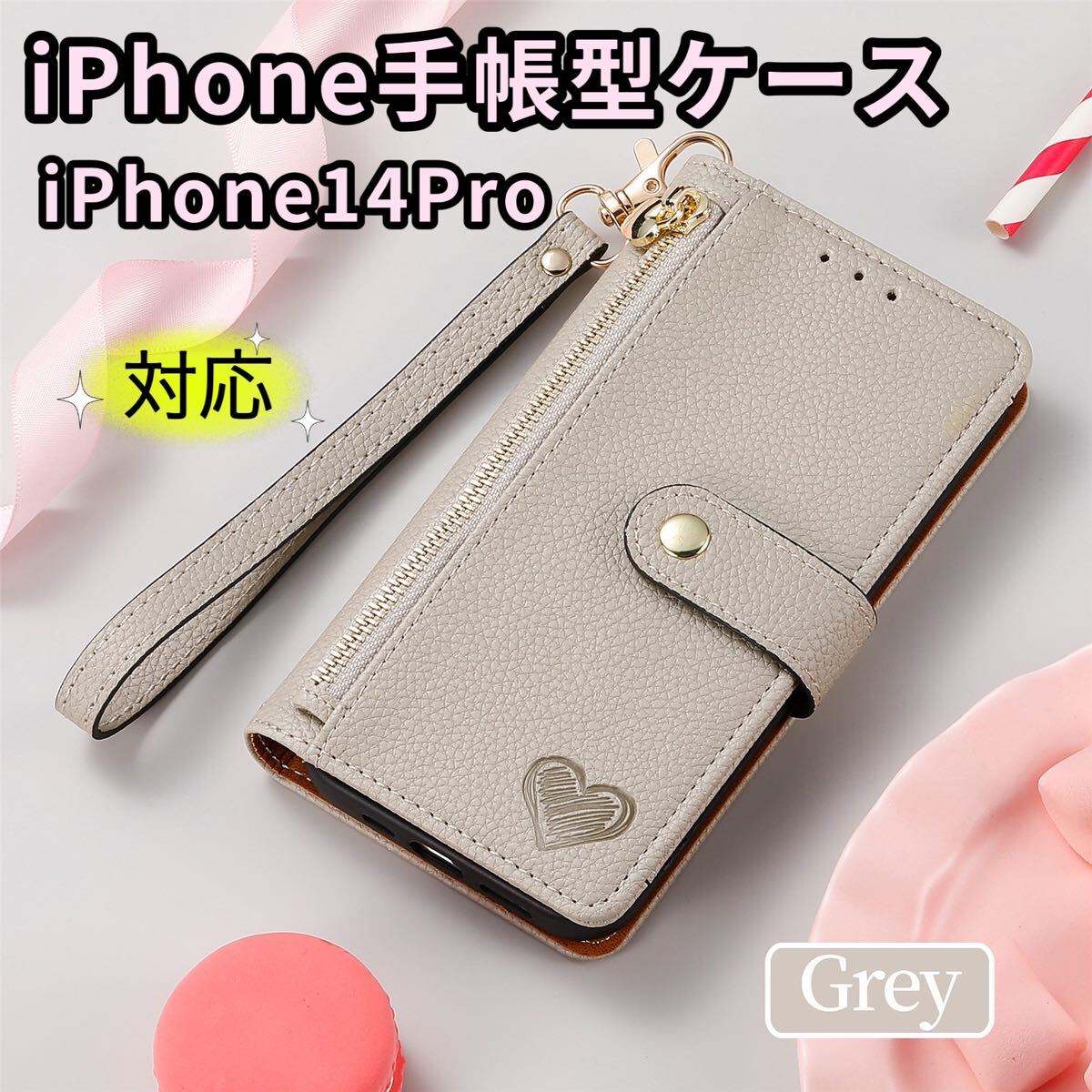 > iPhone14Pro対応 手帳型ケース iPhone14proスマホケース 可愛いiPhoneケース マグネット式 グレー