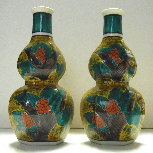 - 九谷焼★角福 六角瓢型徳利 万年青文様 一対