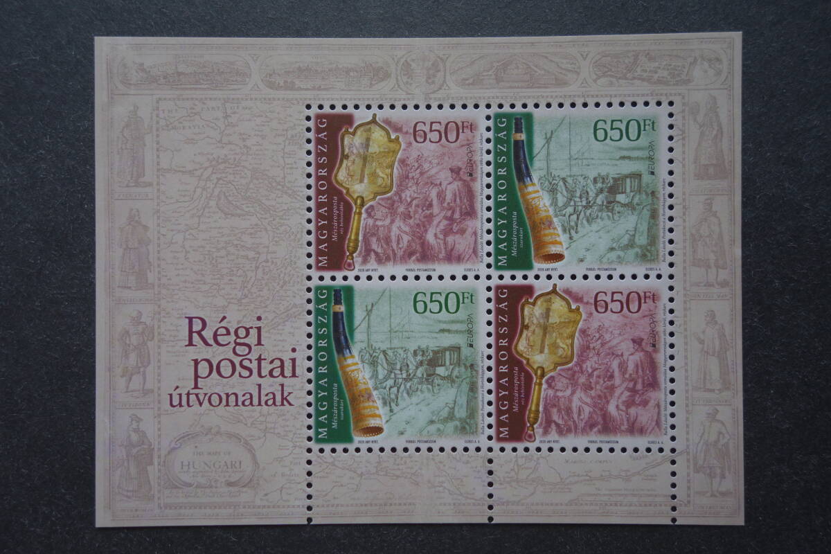 - 外国切手:ハンガリー切手 「(2020年ヨーロッパ切手)共通テーマ・昔の郵便ルート」4面m/s 未使用