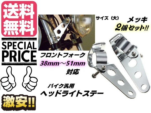 - 単車 バイク用 ヘッドライトステー2個セット メッキ シルバー フロントフォーク 38mm〜51mm対応(大) 送料無料/6