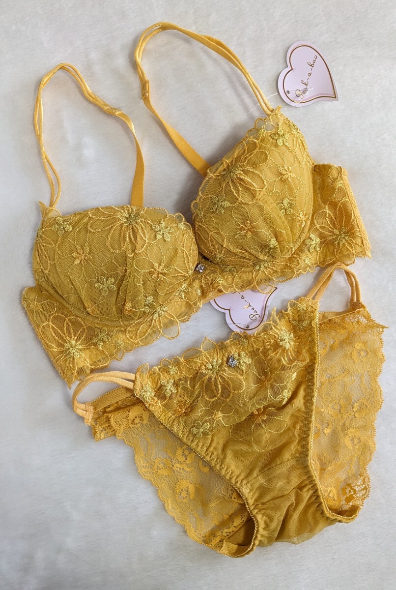 > お泊まりに☆C70ブラ&パンティ上下お揃い☆未使用☆きれいレース☆セクシーサイドダブルストリング☆イエロー☆☆匿名配送可☆タグあり☆
