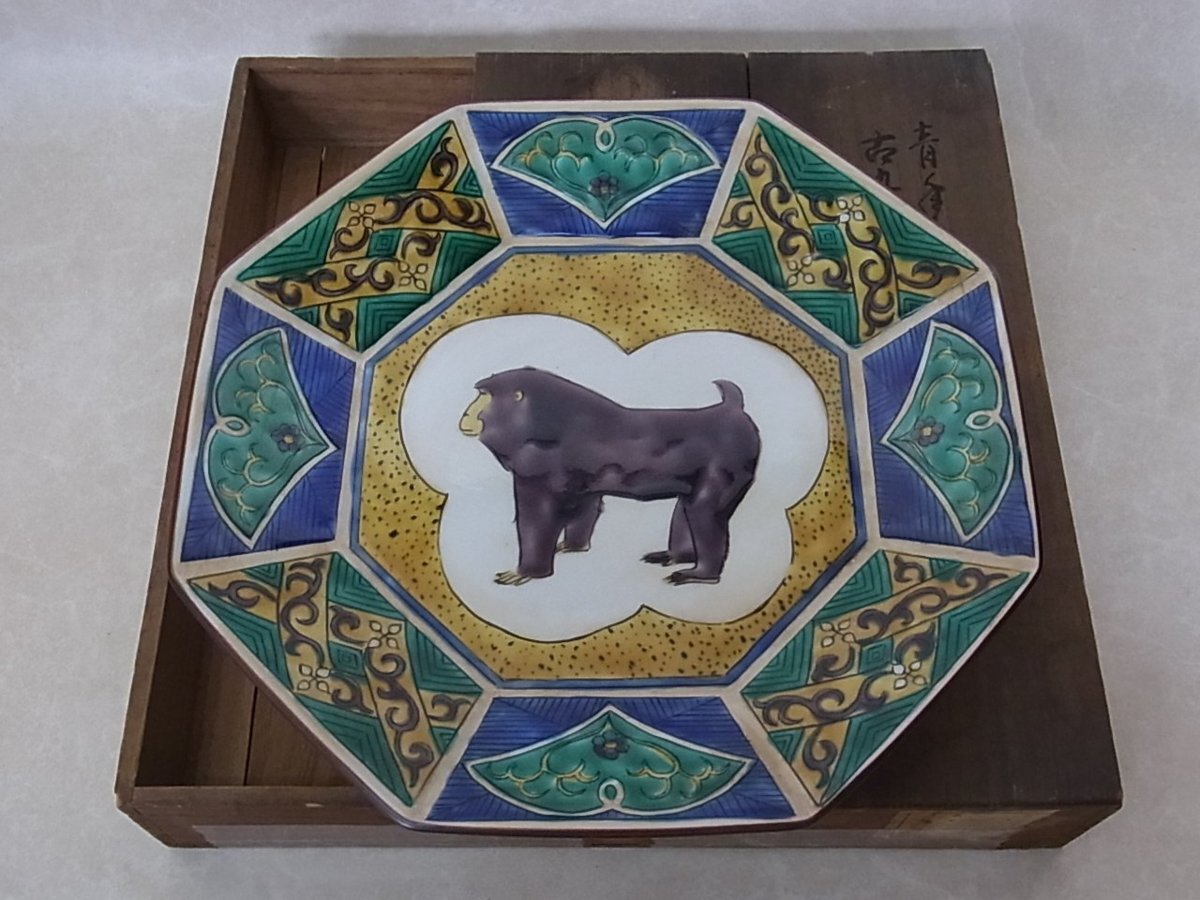 - 【吉田屋浪漫】 青手古九谷 八角飾皿 猿図 絵皿・菓子鉢・平鉢・茶道具・懐石 共箱付 大きさ/28cm