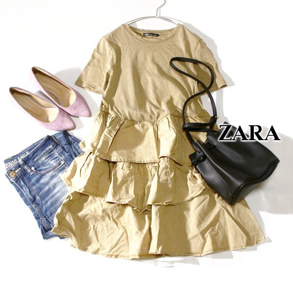> 美品 ザラ ZARA 可愛い ウォッシュ加工 ストレッチ切り替え フリル チュニック S 春 夏 24C08