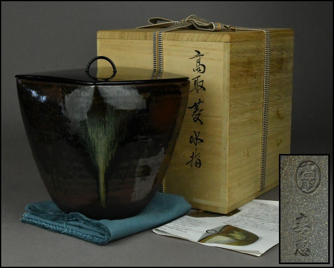 - 高取焼【高取喜恵】高取菱水指 塗蓋 布付 茶道具 DR24-0813