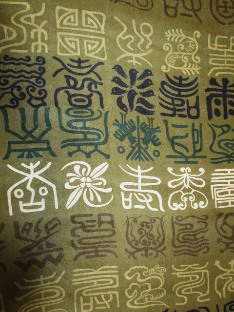 - 男6-11★仏教文字?抽象文字?漢字*正絹*古布はぎれ★一閑張り/掛軸/襖絵/屏風絵/アンティーク