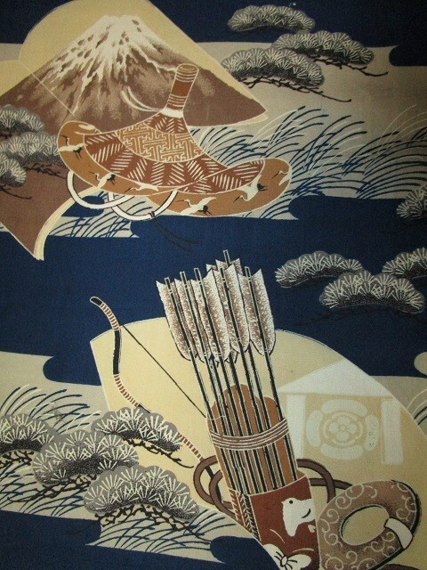 - 男6-24★江戸柄*古書*富士山*武士傘弓矢*鶴*浜千鳥*交織*古布はぎれ★一閑張り/掛軸/襖絵/屏風絵/アンティーク