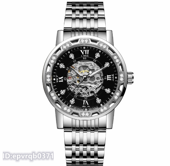 - 高級腕時計 機械式自動巻 メンズ ウォッチ スケルトン 3針 夜光表示 ジルコン飾り ステンレスベルト 紳士 新品未使用 2色選ぶ/シルバー