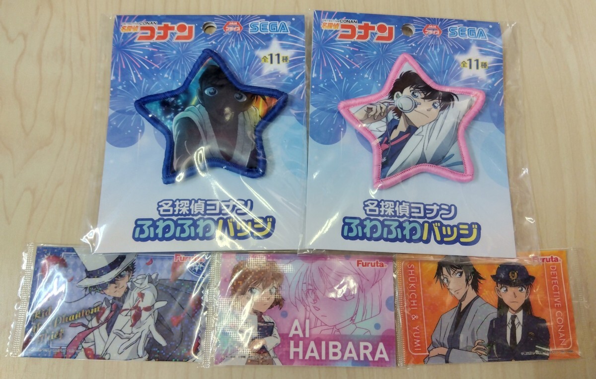 - 名探偵コナン ふわふわバッジ2個セット&ウエハースチョコおまけキラキラシール3枚セット 未使用非売品