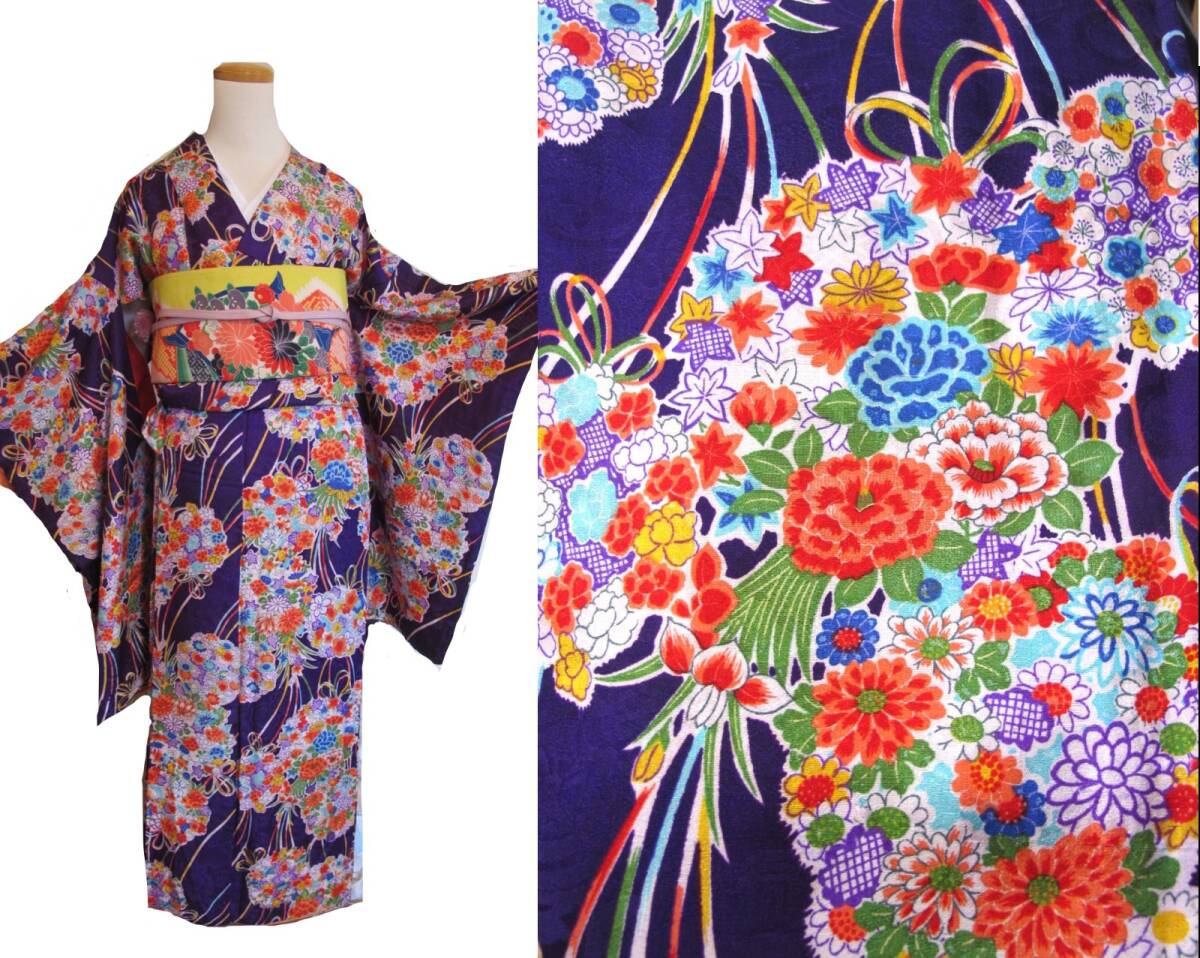 - 華やか 花薬玉尽くし カラフル アンティーク紋錦紗着物 大正ロマン