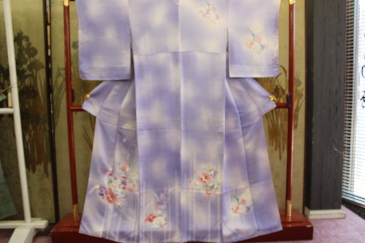 - きもの今昔7550 付け下げ訪問着 広衿袷手縫い仕立て 正絹光沢のある梨地藤色群雲ボカシ地 カトレア花束柄 身丈160cm