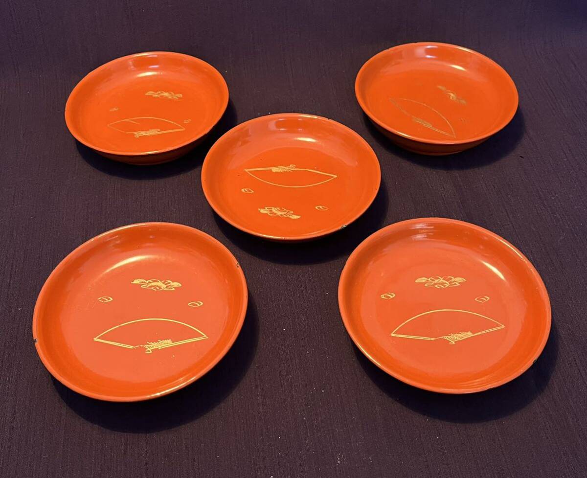 - 朱漆金彩扇図小皿五枚ほつれ有り[7743]