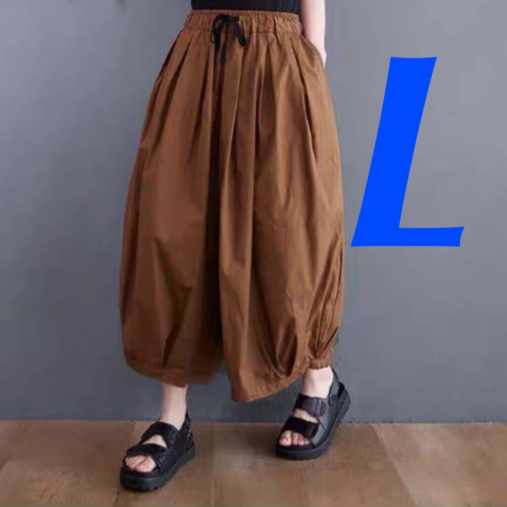 - ワイドパンツ ボトムス カボチャパンツ ハーフパンツ シンプル パンツ 体型カバー イージーパンツ ワイドレッグパンツ ユニセックス 茶 L