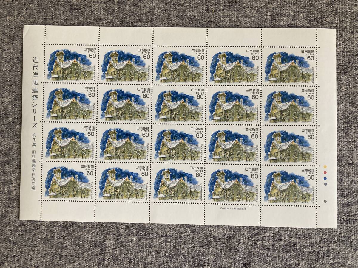 > ★未使用 近代洋風建築シリーズ 第3集 旧札幌農学校演武場 北海道 札幌市時計台 1982年 昭和57年 切手シート 60円 20枚 日本郵便