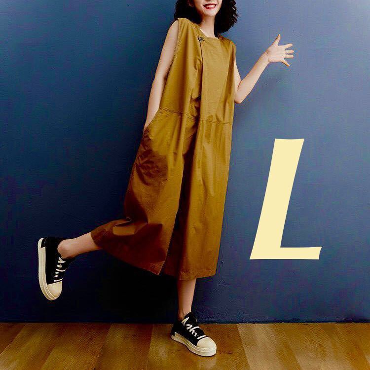 - サロペット オールインワン ノースリーブ ワンピース ワイドパンツ ボトムス つなぎ 体型カバー レディース トレンド イエロー 黄色 L