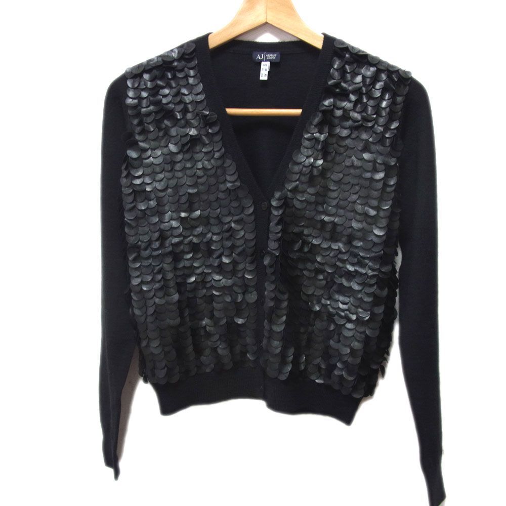 - 美品 定価3万円以上●ARMANI JEANS アルマーニ カーディガン ニット ジャケット レディース XS 正規品 ブラック エコレザー フリル 秋物