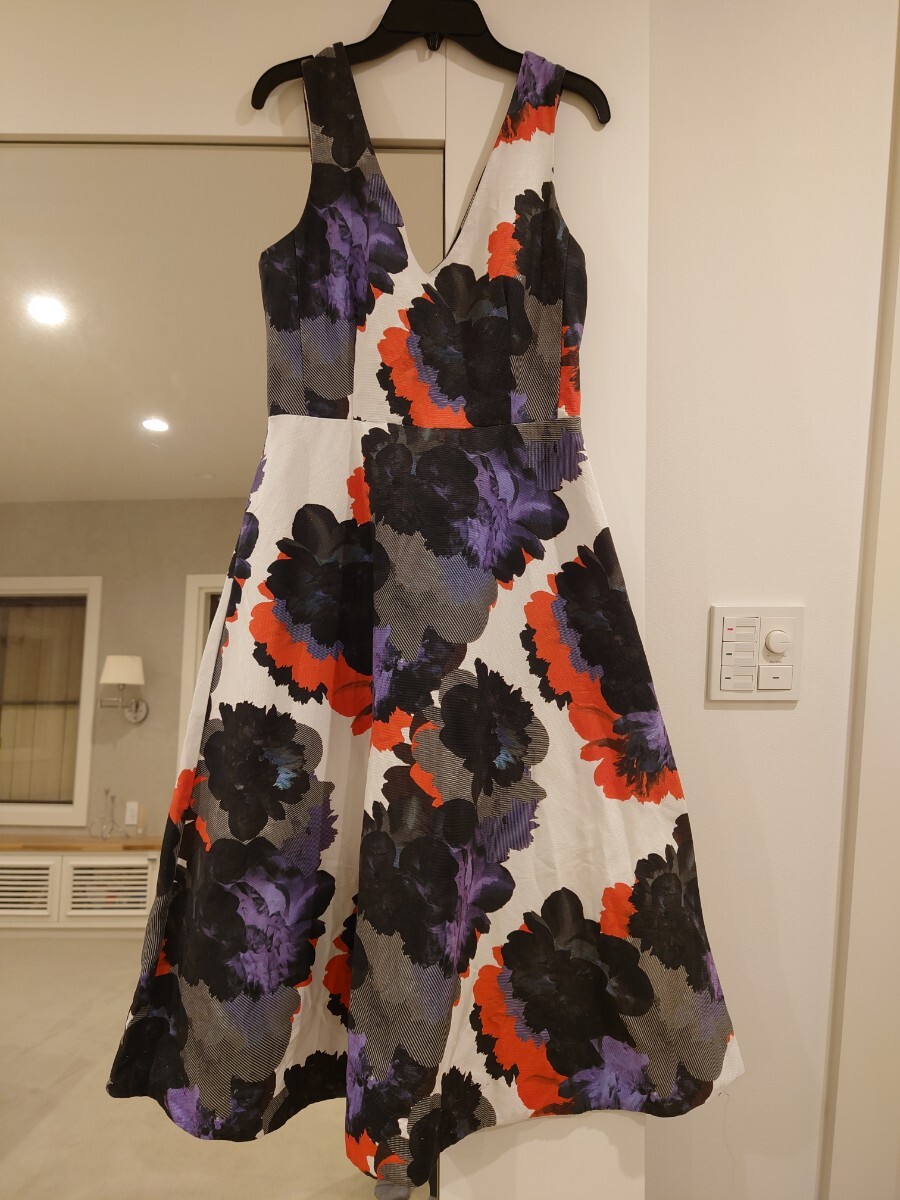 - 赤黒紫花柄ひざ丈ワンピース Мサイズ