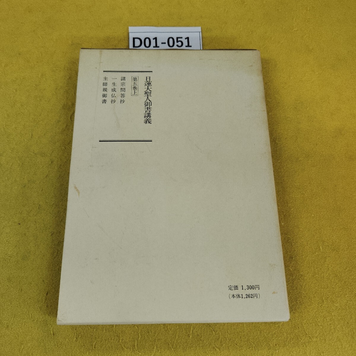 - D01-051 日蓮大聖人御書講義 第5巻上 諸宗問答抄/一生成仏/主師親御書 聖教新聞社 平成2年3月初版 外箱に日焼け汚れ傷多数あり。