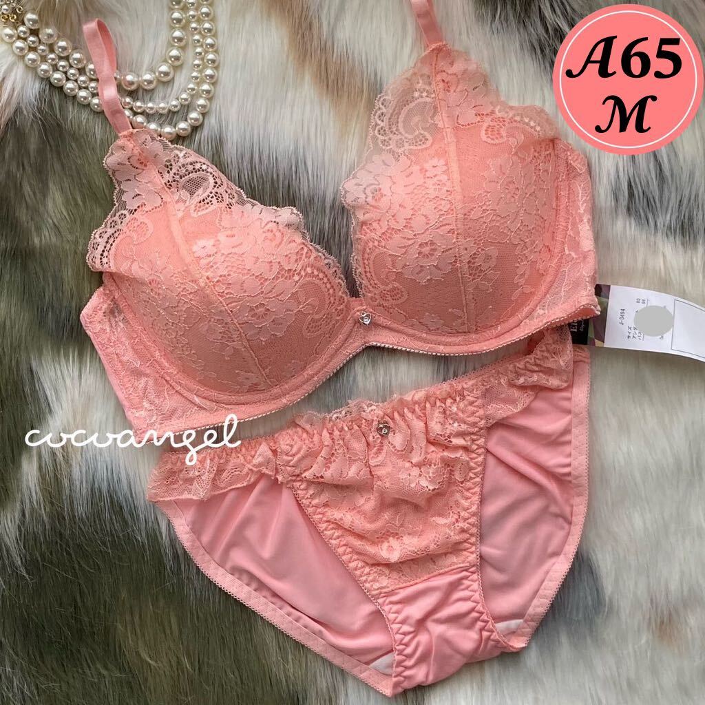 > 【A65/M オレンジ系 上下セット】新品 ブラ&ショーツセット ブラジャー ショーツ パッド内蔵 レース かわいい 小さいサイズ Aカップ