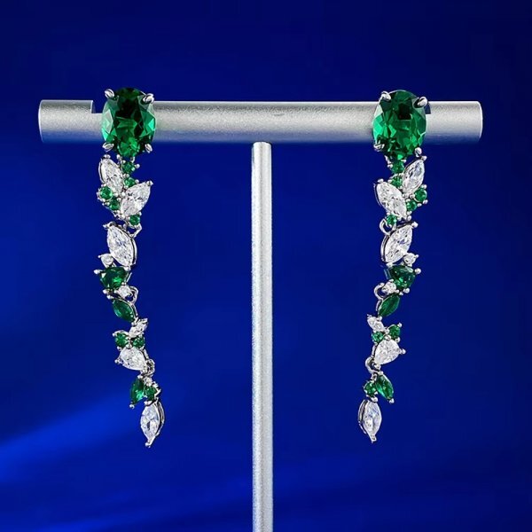 エメラルドピアス、925スターリングシルバー、高炭素ダイヤモンド