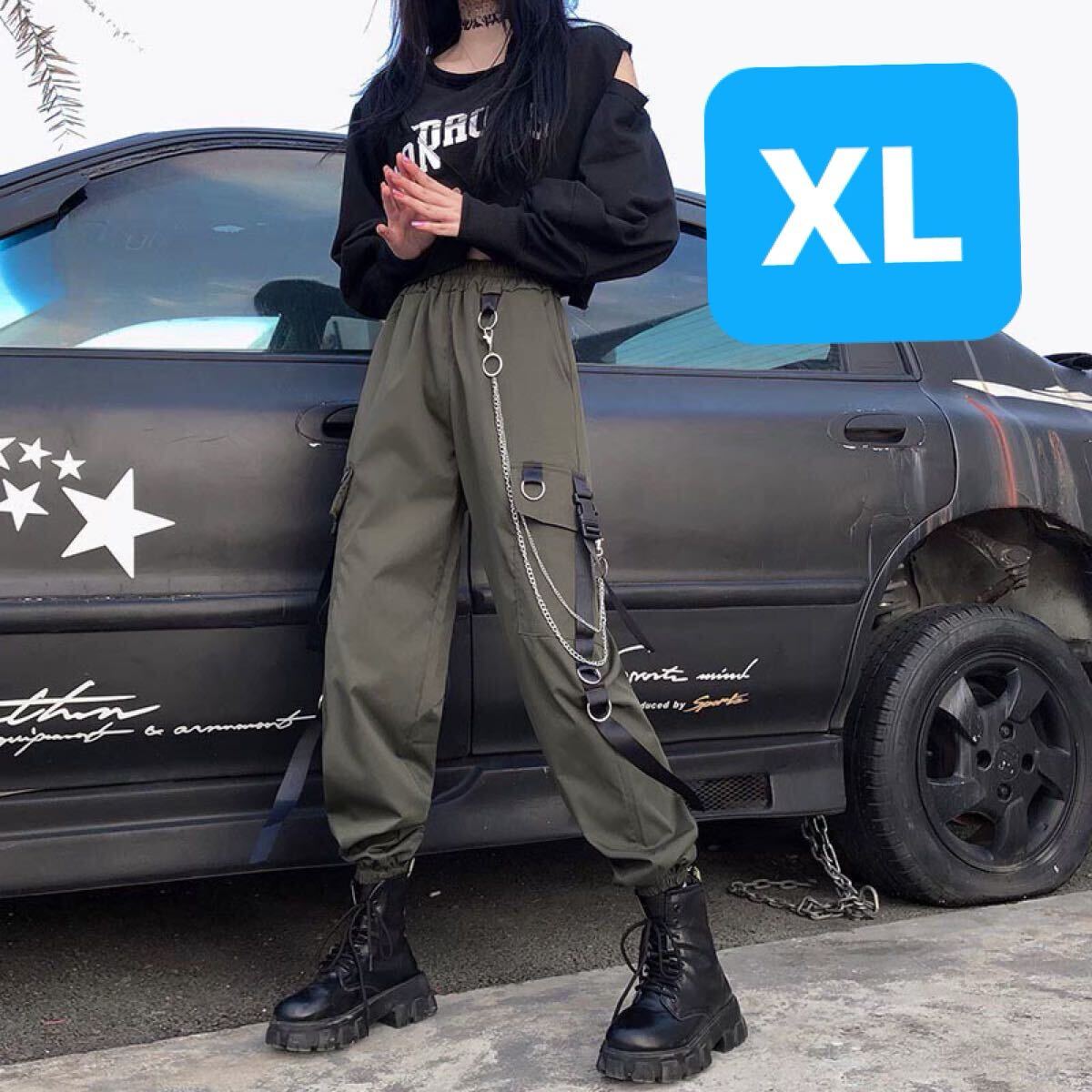 - ジョガーパンツ テーパードパンツ チェーン ストリート カーゴパンツ トレンド ストリート メンズ レディース カーキ 緑 グリーン XL