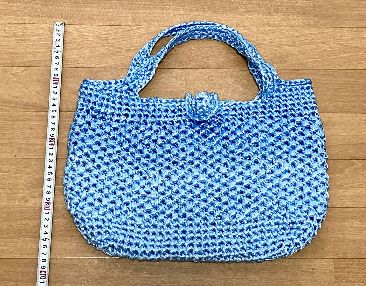 - ハンドメイド・手編み◆スズランテープ☆トートバッグ★大きめエコバッグ★カバン☆丸み有【水色・止めボタン】かぎ針編み・ビニール