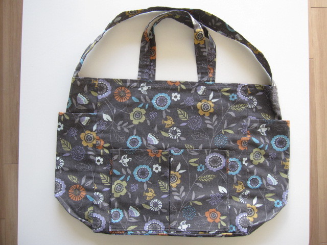 - ○ハンドメイド○大きなトートバッグ〔植物・花 オレンジ・水色 焦茶色地〕ポケットたくさん 卵10個パックが入るサイドボケット