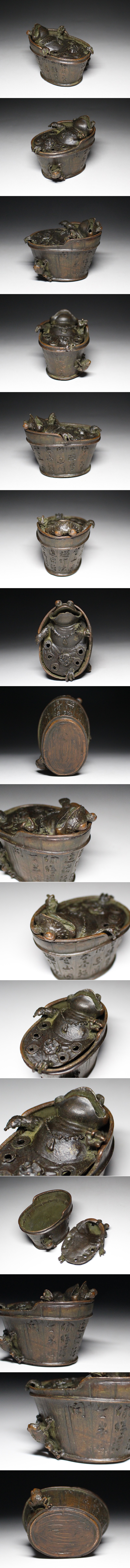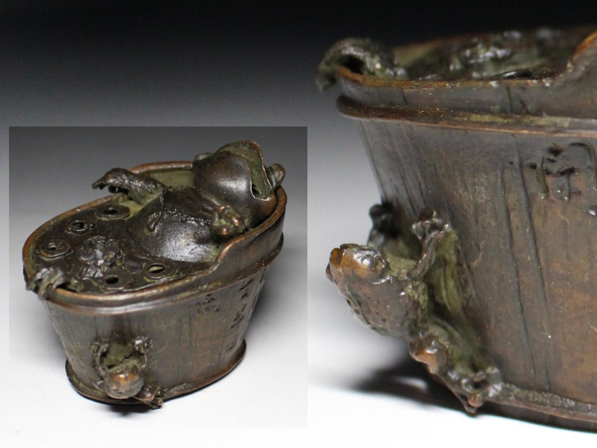 - ■古銅■蛙・香炉・カエル・線香立・置物・小物入・幅11㌢・細密細工・煎茶飾り・盆景・香道具・f3176h