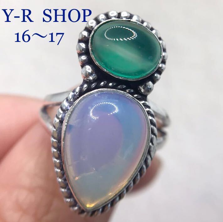 > 天然石★16号17号★グリーンアゲートとムーンストーンのアンティーク調リング★レディース指輪シルバー 925刻印エスニックアジアン雑貨新品
