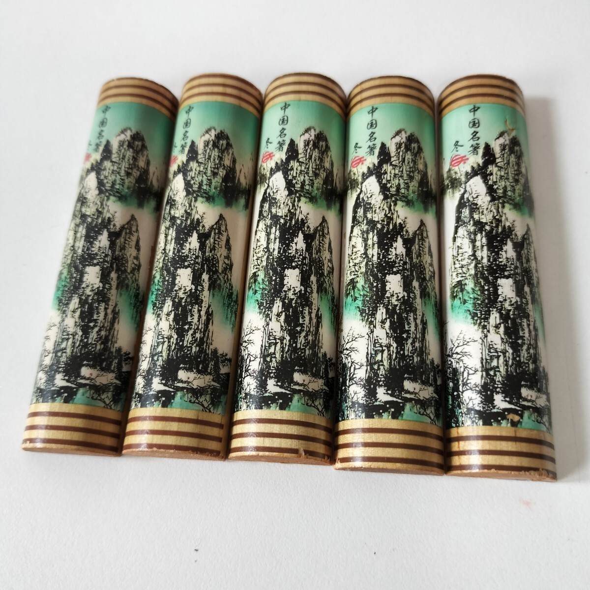 - 1980s~1990s 中国製 中国名箸 冬 山水画 木製 箸置き 5点セット 未使用品