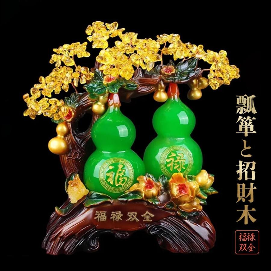 - 風水 招財木 福禄双全 ひょうたんと招財木 グリーン ヒーリングツリー 招財樹 金のなる木 風水アイテム 金運アップ 財運 金運 置物 健康