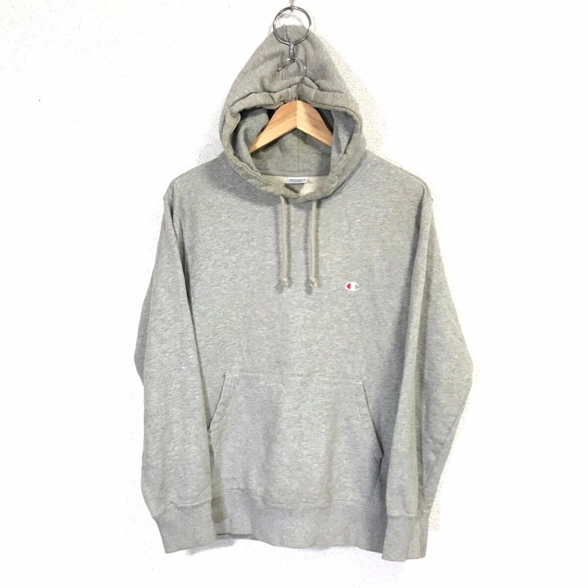> h396dL Champion チャンピオン サイズL スウェットパーカー フードパーカー プルオーバー グレー メンズ ワンポイントロゴ 古着 綿100%