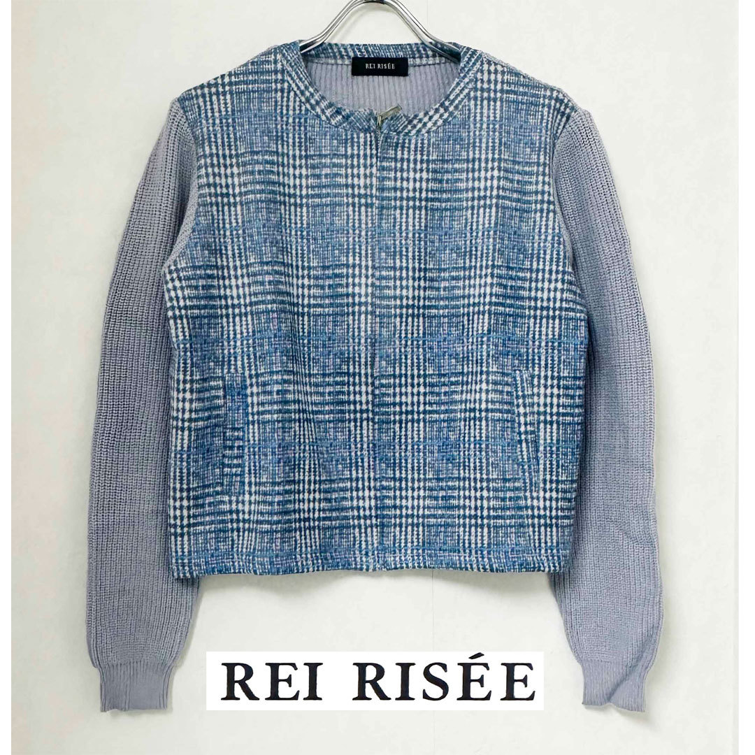 - 新品 M ★ コストコ REI RISEE ジップアップ 異素材 スエード ニット カーディガン ブルー チェック レイリーゼ レディース ジャケット