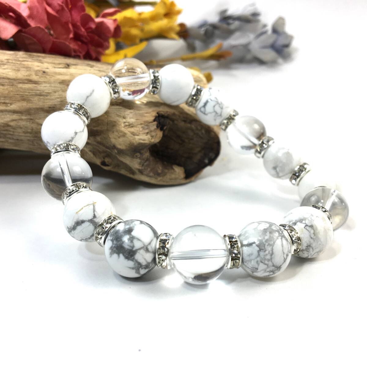 - ハウライト&水晶 パワーストーン ブレスレット 天然石ブレス (シルバー) 12mm 幸運 開運 メンズ 男性