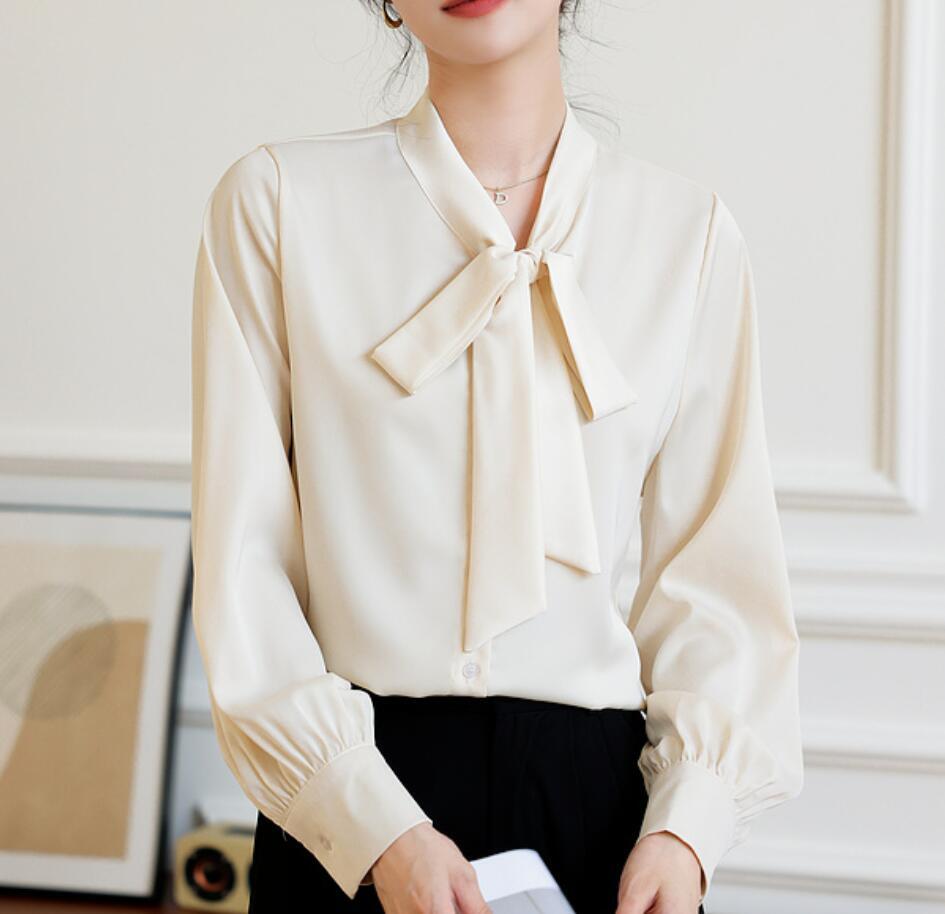 - 秋冬/ボウタイブラウス レディース シャツ トップス 長袖 シャツ ブラウス カジュアル 大人 オフィス ビジネス シャツ 通勤 上品 /杏