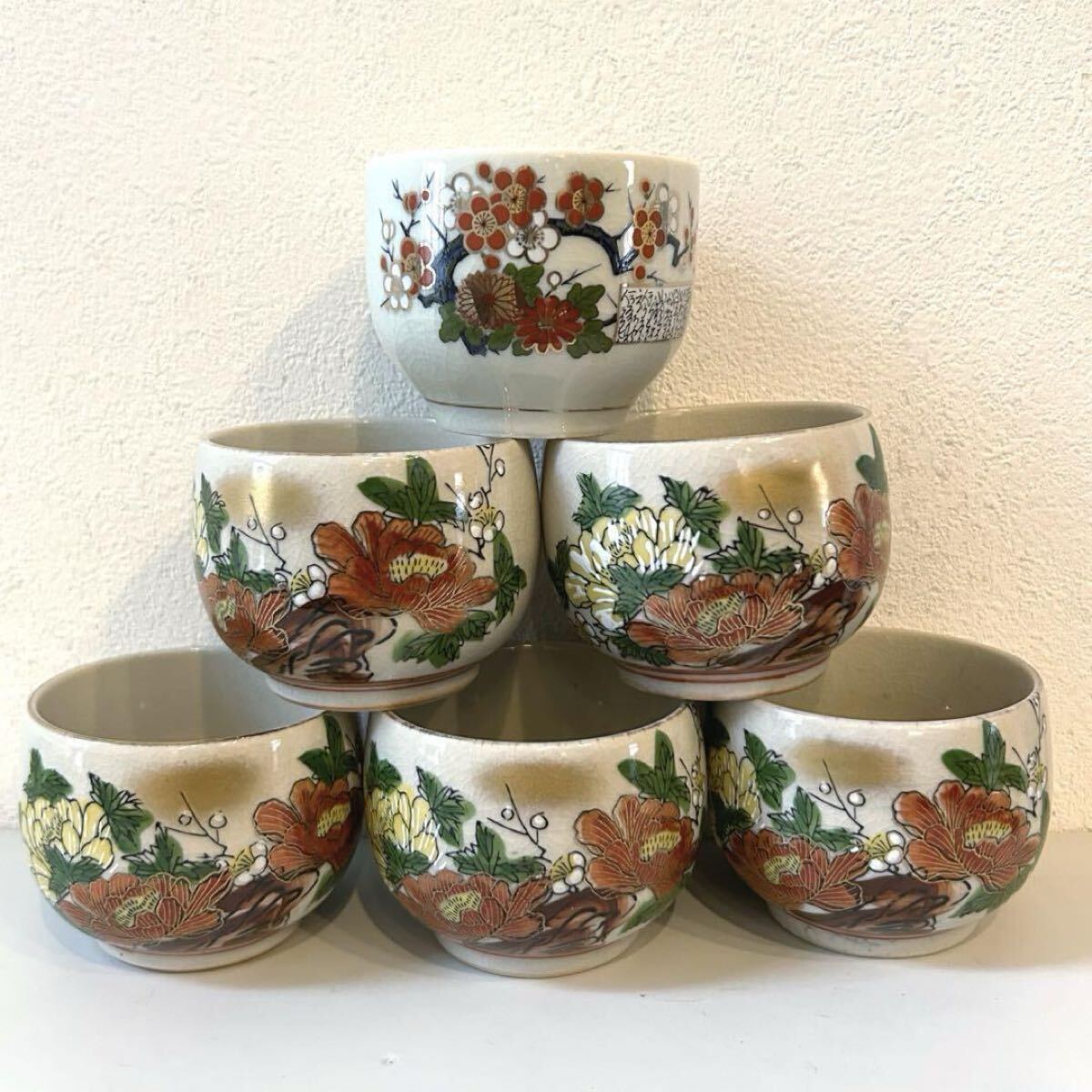 - 九谷焼 湯呑み茶碗 6客セット ヴィンテージ レトロ茶器 湯呑み 花