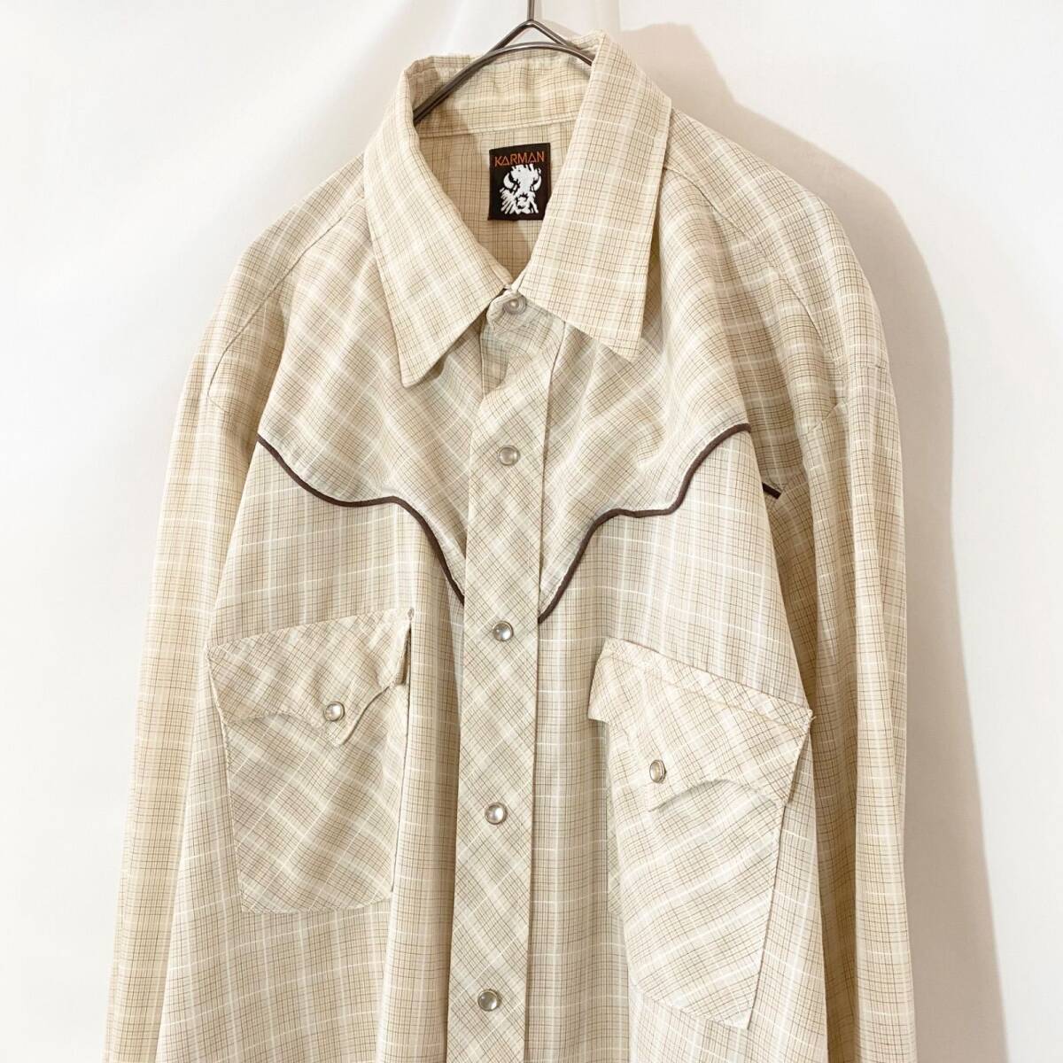 - 古着 80s USA古着 ウエスタンシャツ 長袖 シャツ チェック柄 チェックシャツ スナップボタン パイピング ベージュ Lサイズ
