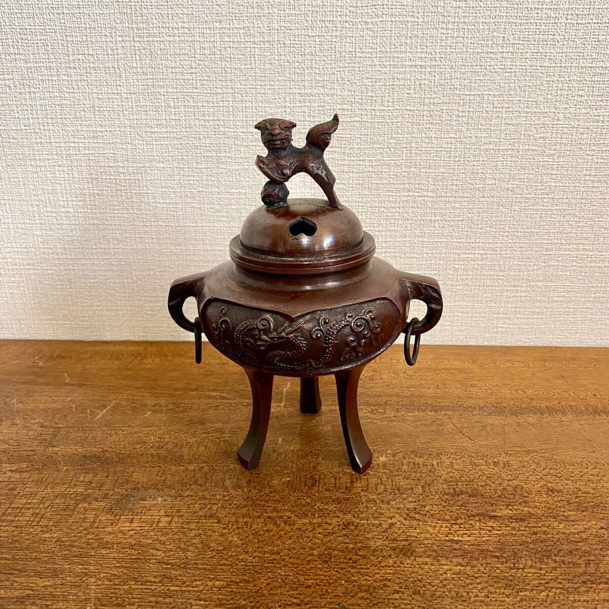- 銅製 三つ足 龍地文 香炉 獅子蓋付 / 香道具 双耳 骨董 茶道具