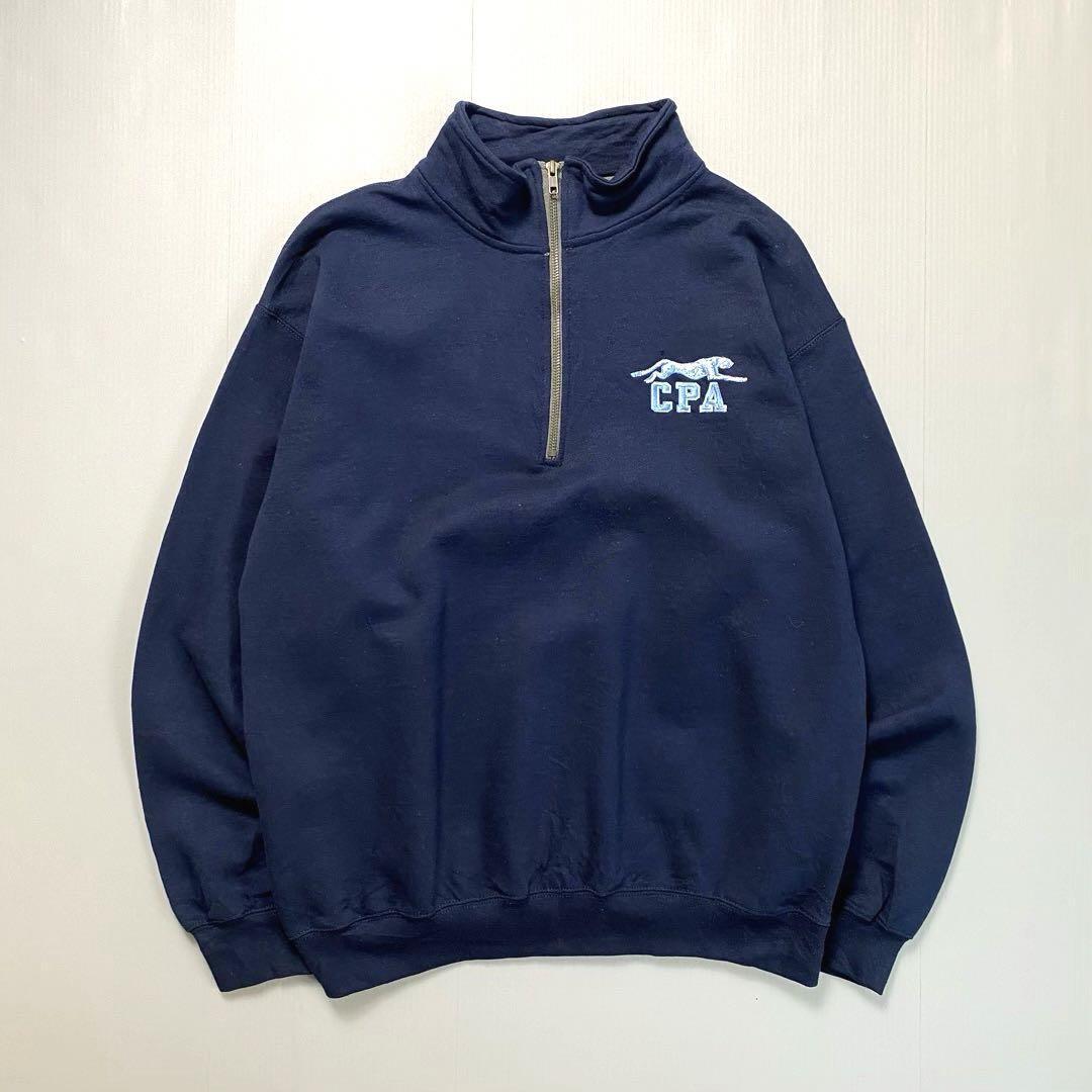 - USA古着 GILDAN ギルダン ハーフジップ スウェット トレーナー 裏起毛 カレッジロゴ 企業ロゴ 刺繍 チーター アニマル 紺色 ネイビー M