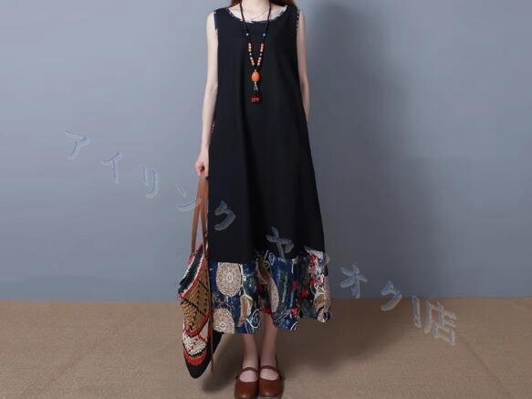 - ☆新品コットン風素材の裾オリエンタル柄がおしゃれなノースリーワンピ 裾模様がおしゃれなマキシ丈ワンピ黒