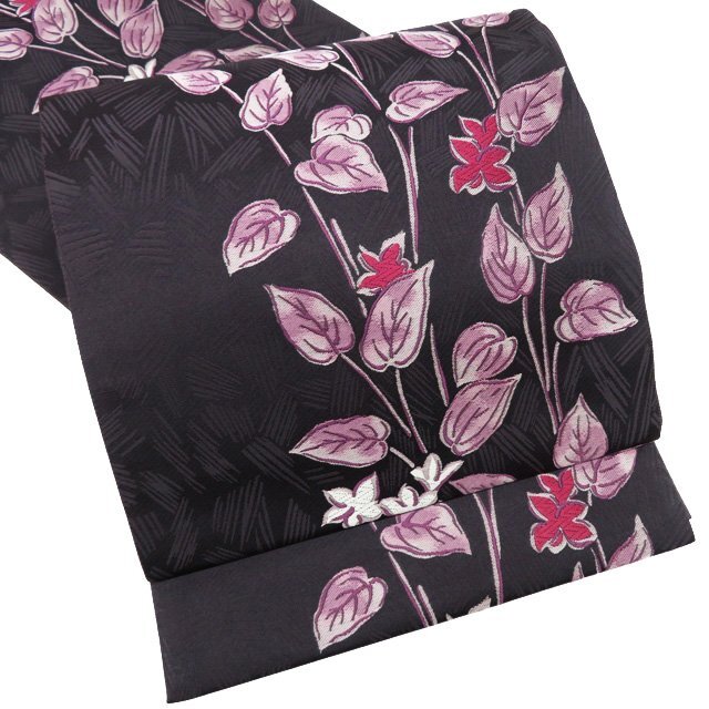 - 袋帯 未使用 正絹 カジュアル 仕立て上がり 花模様 六通 紫鈍色 多色 きもの北條 A1103-13
