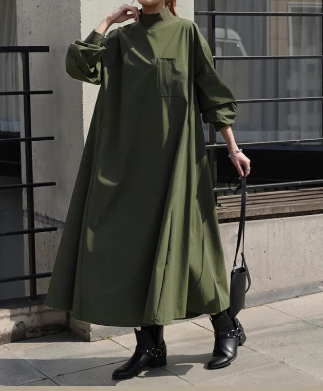 > 新品未使用新品秋リブ素材のモックネックで後ろファスナーのAラインたっぷりワンピ大きいサイズ ゆったりマキシ丈ワンピ 軍緑 XLサイズ以上